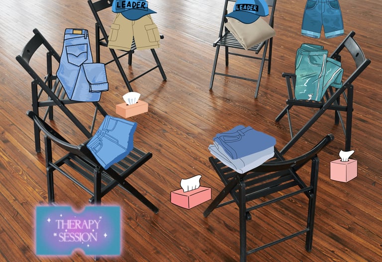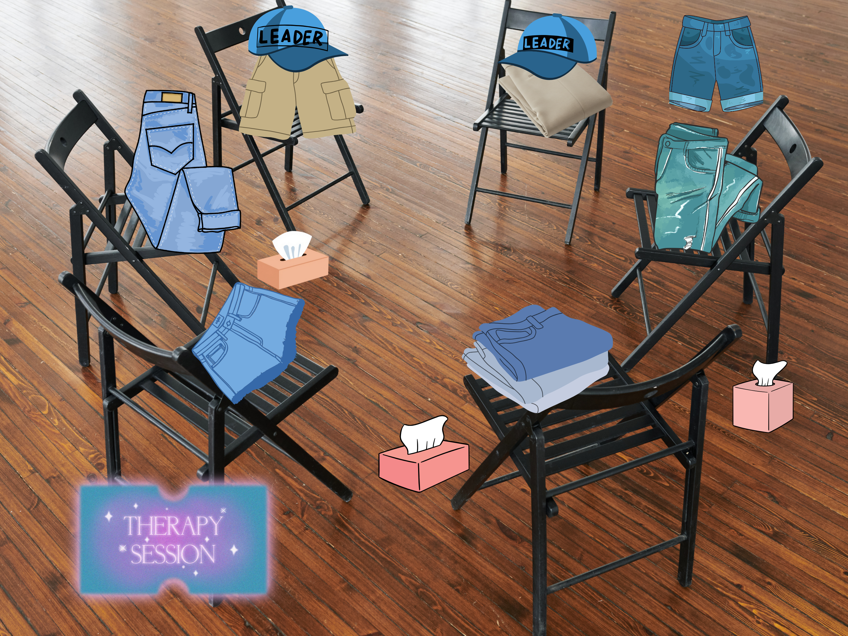Welcome to Denim Group Therapy, a weekly support group for jeans grappling with the environmental trauma of their own existence. The session is co-led by therapists: Pat, a tough but firm former cargo short and Sage, a calm and un-dyed hemp pant. The session leaders offer a safe space for denim to process their existential distress. “It’s about acknowledging harm without unraveling at the seams,” Pat explains gesturing toward a shredded pair of Abercrombie cutoffs rocking gently in their seat. “Many of you were told your acid wash made you edgy, desirable. But deep down you know the cost.”