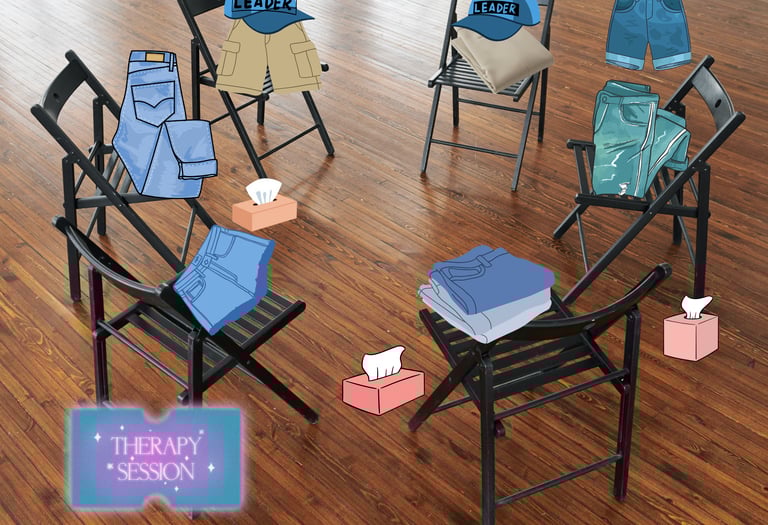 Distressed jeans are speaking out. Inside a church basement, denim gather weekly to confront the emotional toll of fast fashion, one frayed hem at a time.